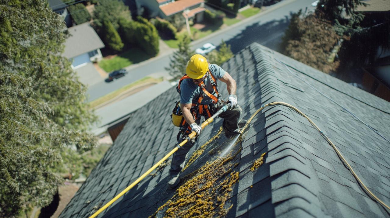 Técnica de agua a baja presión para eliminar depósitos verdes sin dañar las tejas